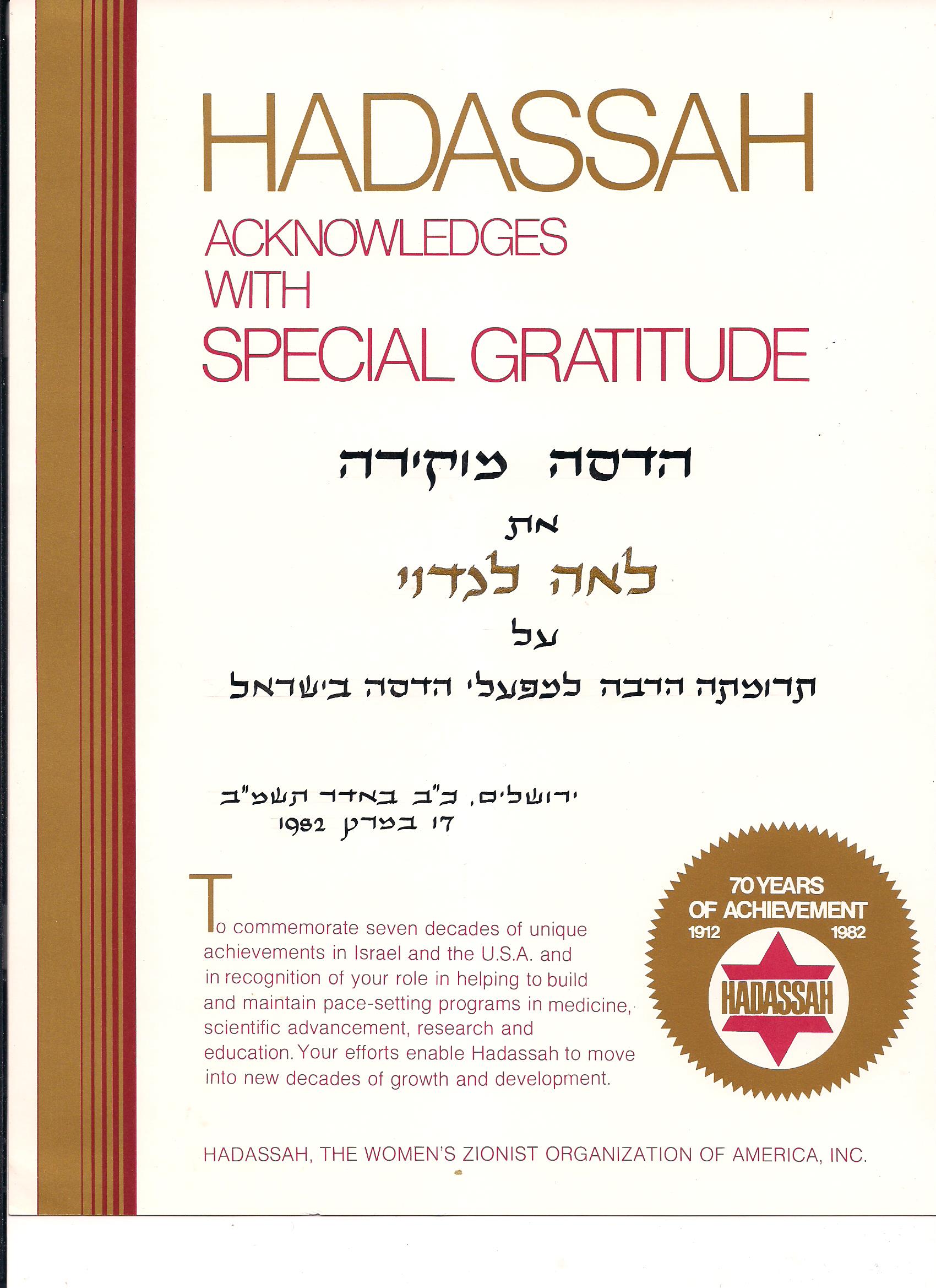 תעודת הוקרה מארגון הדסה, 1982
