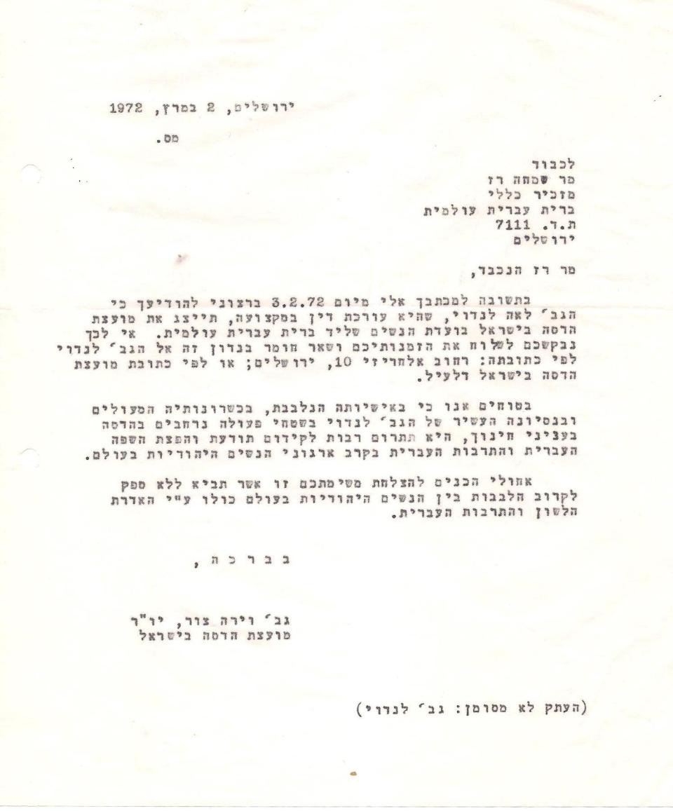 מכתב בנוגע למינוי כנציגה בברית עברית עולמית, 1972