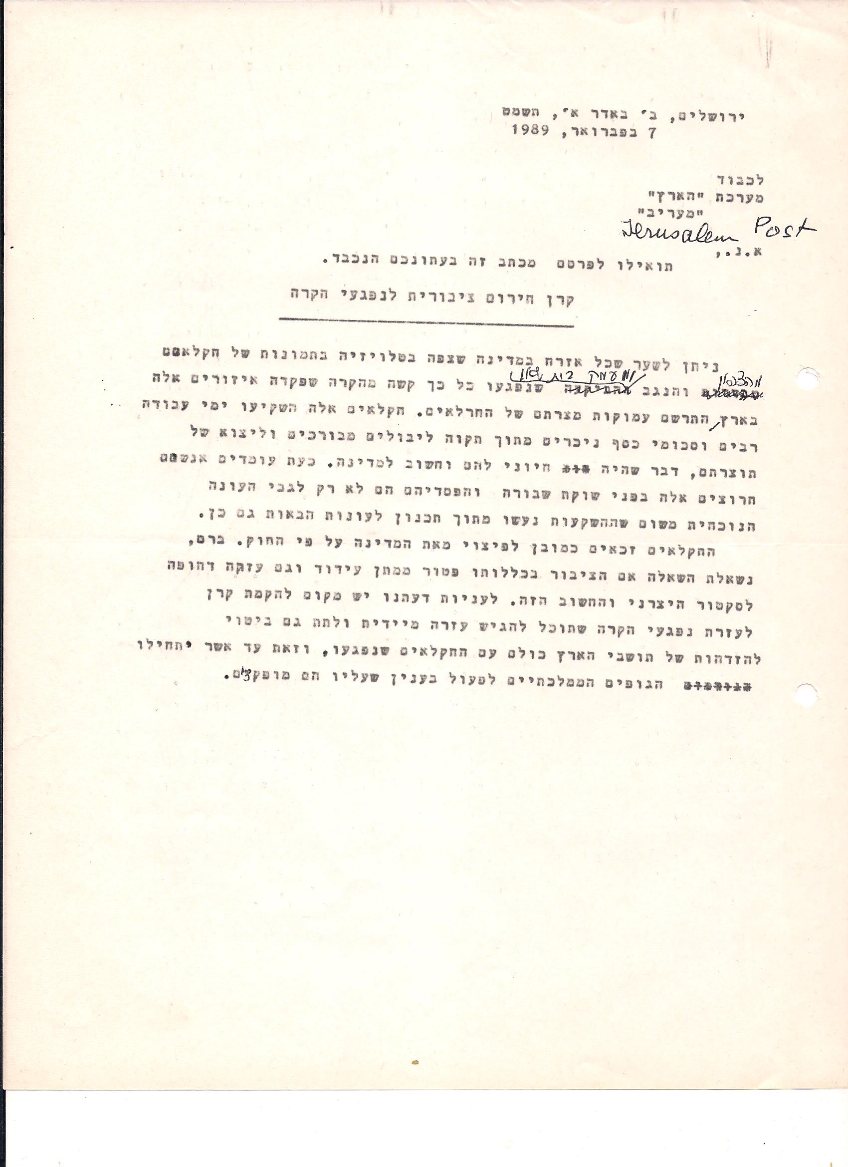 מכתב למערכות עיתונים – קרן חירום ציבורית לנפגעי הקרה, 1989